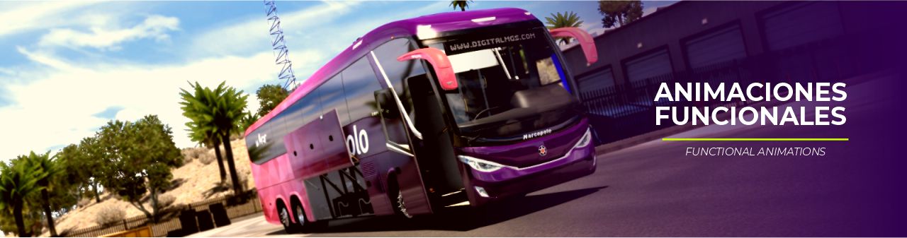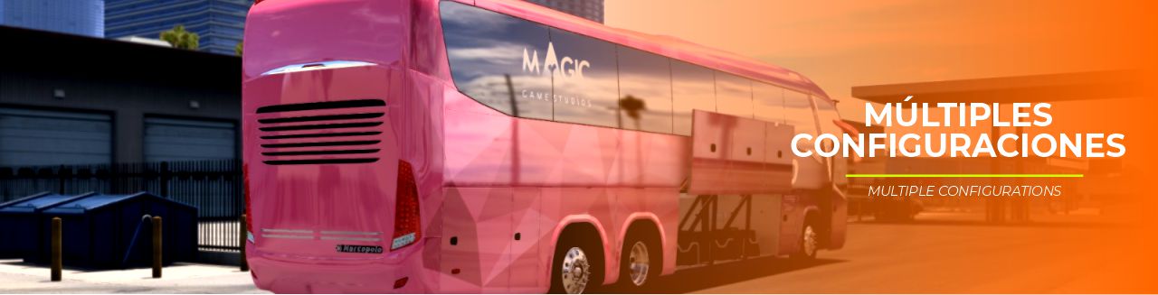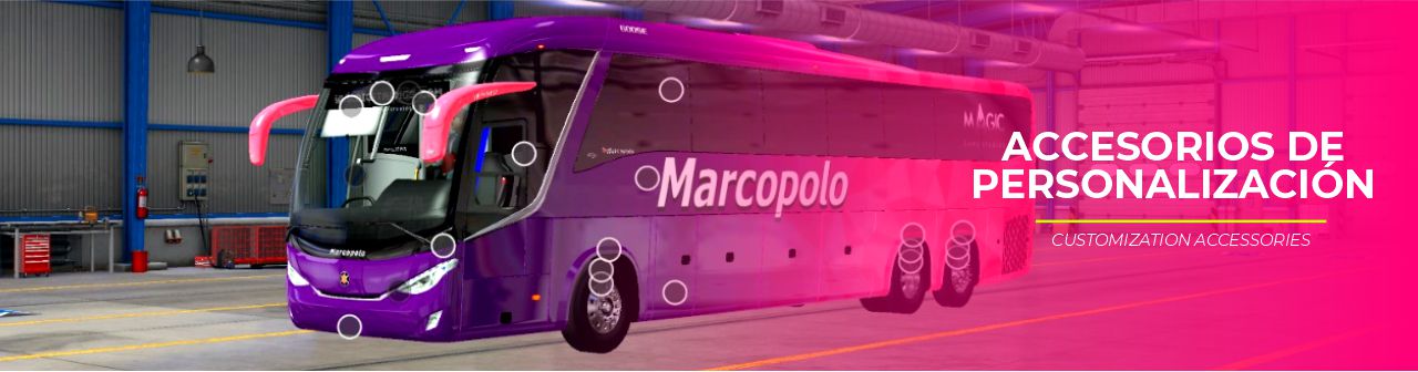 Amplia selección de skins oficiales y personalizables para adaptar el autobús a diferentes operadores o rutas, además de accesorios como asientos 4×1 y 3×1, placas personalizadas, vigías de presión de neumáticos, destinos, persianas de piloto y copiloto, pasajeros, entre otros.