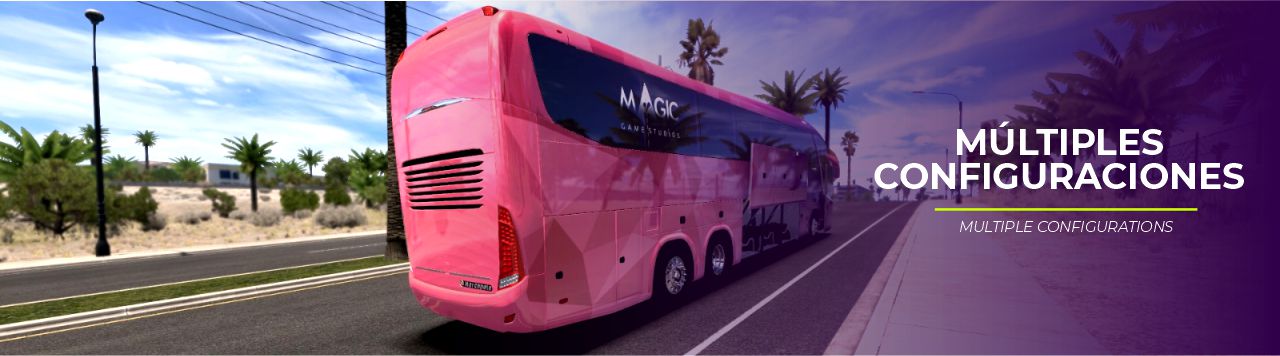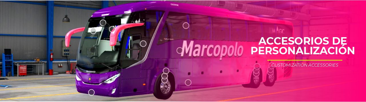 Amplia selección de skins oficiales y personalizables para adaptar el autobús a diferentes operadores o rutas, además de accesorios como asientos 4×1 y 3×1, placas personalizadas, vigías de presión de neumáticos, destinos, persianas de piloto y copiloto, pasajeros, entre otros.